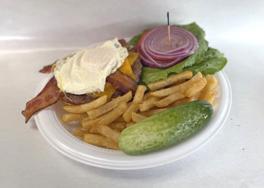 Sirloin burger, bacon, lettuce, tomato & choice of cheddar, swiss, provolone, american or feta, cheese, pickle and choice of french fries or potato salad. Add egg for $1.50.