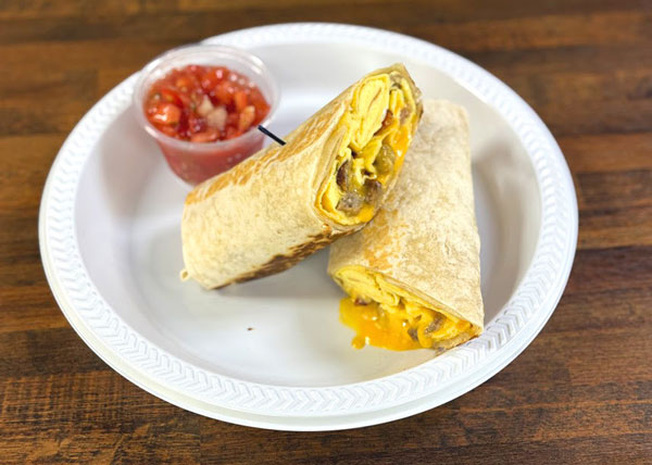 3 scrambled eggs, bacon, sausage, & cheese served with pico de gallo.